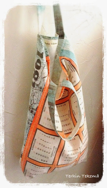 Ompelin pyyhkeen kuvan ja kalenteriosat tuolleen sivuttain koska muuten kassista mielestäni olisi tullut liian leveä. Sain leikattua myös kantokahvat samasta kankaasta kun päädyin tähän ratkaisuun.